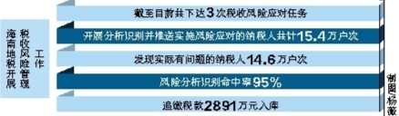据了解,海南地税开展税收风险管理工作以来,共下达3次税收风险应对任务,开展分析识别并推送实施风险应对的纳税人共计15.4万户次,发现实际有问题的纳税人14.6万户次,风险分析识别命中率95%,追缴税款2891万元入库。