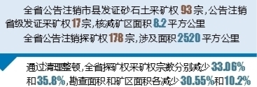 近几年来,我省下大力气整合清理矿业权,出台矿产资源开发整合实施方案,提高环保门槛,对不符合土地利用及环保规划的采矿权予以取消,不得出让采矿权。对不符合要求已到期的采矿权,坚决清理取缔,大幅度整顿缩减原有矿业权。全省共注销市县发证砂石土采矿权93宗,公告注销省级发证采矿权17宗,核减矿区面积8.2平方公里;公告注销探矿权178宗,涉及面积2520平方公里。通过清理整顿,全省探矿权采矿权宗数分别减少了33.06%和35.8%,勘查面积和矿区面积各减少了30.55%和10.2%。