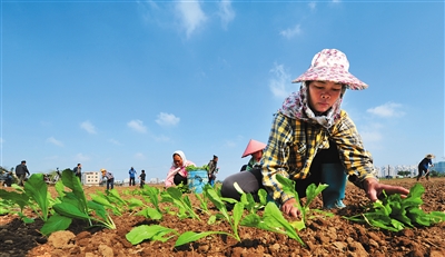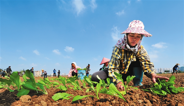 1月3日,南北蔬菜批发市场同海口石塔村协商,从租地到种植,前后10天左右的时间,一切准备就绪。在石塔村的菜地上,菜农们一边忙碌着将小白菜苗插到地里,一边有条不紊地给刚种上的菜苗浇水。“我们把土地免费租给农民,提供种子、化肥和遮阳棚,让附近的这些有种植经验的农民来种,待蔬菜长成后,农民可以卖给我们,如果供过于求,卖不出去,我们南北蔬菜批发市场可以进行包装,面向省内销售。”柯越秀说。