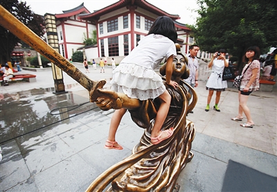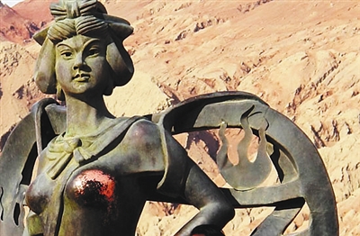 位于新疆吐鲁番的火焰山风景区,是国家AAA级景区,位于新疆吐鲁番东面10公里处。景区因神话传说和独特的自然景观而著称。地面景观区北面,有孙悟空、铁扇公主及牛魔王的大型铜雕,其造型出自《西游记》中唐僧取经路过火焰山、孙悟空三借芭蕉扇的神话传说。而风景区铁扇公主的雕像,由于游客参观游览时的举止不雅,攀爬铁扇公主和牛魔王等雕塑摆酷照相,导致铁扇公主“敏感”部位“裸露”,牛魔王坐下骑的牛鼻子等处“失色”,与火焰山风景区壮美的自然景观形成强烈反差,极为不雅。
