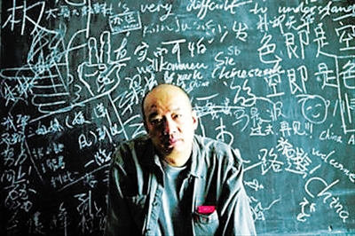 他画一个长衫男子,在书桌前揽书自读,题诗:“白天忙些烂事/ 夜半看册闲书/虽说身不由己/不能活得像猪” 。