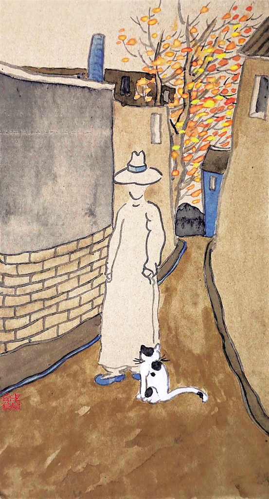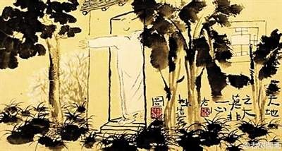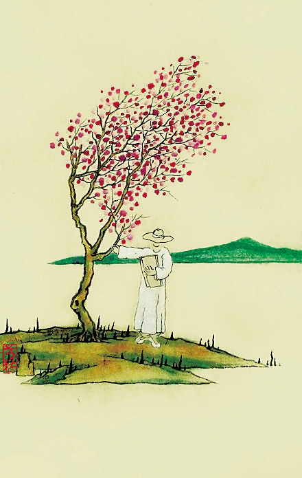 老树常画一个穿民国水墨长衫的男子,或花前吹笛,或踽踽独行山边,或树下发呆,或挂树枝摇荡,或在桌前抛书,或于地里抱花,这个长衫男子没有五官,没有表情,也没有头发,我一直是这样想——这一定不是老树,也一定就是老树。