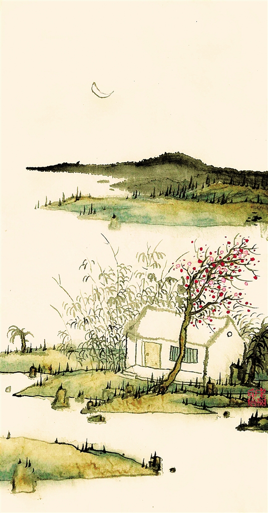 他画一个长衫男子,在芦苇乱长的河边独自玩石子打水漂儿,题诗:“拣起一块石头/打了一个水漂儿/为何忽然这样/自己也不知道”。