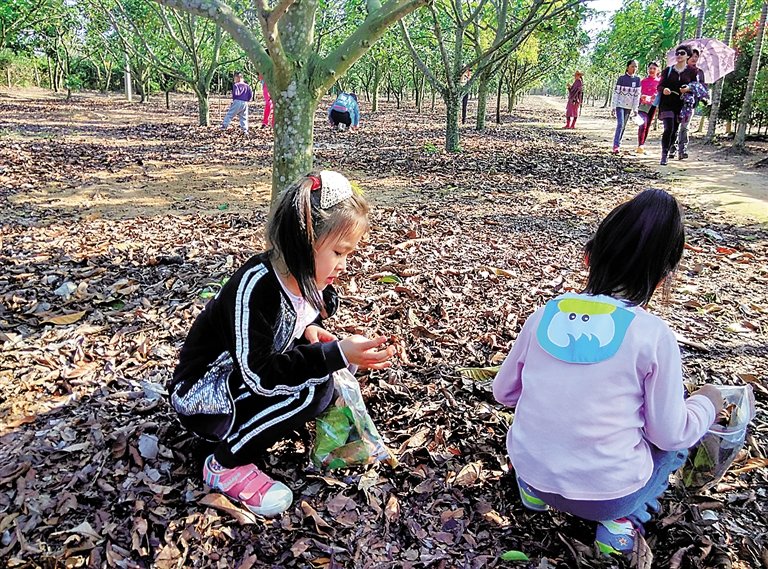 1月10日,琼海市南牛岭大瀑布旁,活跃着一群欢快又好学的小“松鼠”。他们和来自中国热带农业科学院的博士黄胜卓一起,或仰头观察周边的热带植物生长特性,或蹲在地上细心地寻找那些有着美丽色泽的小石头,再欢呼雀跃地拿着它们跑到爸爸妈妈面前“炫耀”新学到的新知识:红石头含铁,绿石头含铜……