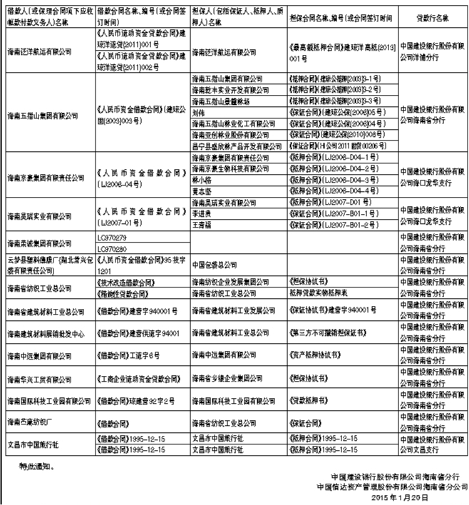 2014年12月12日,中国建设银行股份有限公司海南省分行(以下简称“建行”)与中国信达资产管理股份有限公司海南省分公司(以下简称“信达”)签署《资产转让合同》,建行将其依法享有的下列公告清单中所列借款人及其担保人享有的主债权及担保合同项下的全部权利依法转让给信达。建行现以公告方式通知债务人和担保人。请借款人和相应担保人或借款人、担保人的承继人向信达履行还款义务(若借款人、担保人因各种原因发生更名、改制、歇业、吊销营业执照或者丧失民事主体资格等情形,请相关承债主体、清算主体代为履行义务或者承担清算责任)。