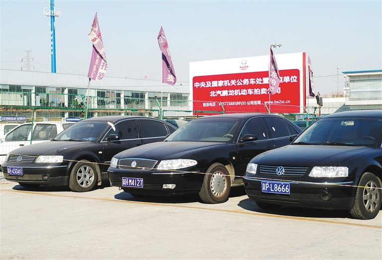 1月22日,待拍的公车停放在北京新发地汽车市场内的北京北汽鹏龙机动车拍卖有限公司内部停车场。 首批中央和国家机关取消的3184辆公务用车已全部封存停驶,首批304辆公车的拍卖即将进行。新华社发