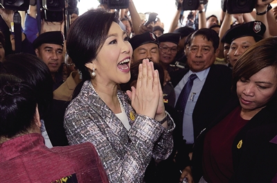 1月22日,在泰国曼谷,泰国前总理英拉(中)向媒体记者致意。 当日,泰国前总理英拉前往位于曼谷的国会为自己做弹劾案最后辩护。泰国国家立法议会本月9日开始审理一起针对前总理英拉的弹劾案,理由是英拉在大米收购项目中存在渎职行为。一旦确认弹劾,英拉将被禁止5年之内参政,并将因此失去参加2016年大选的资格。 新华社/法新