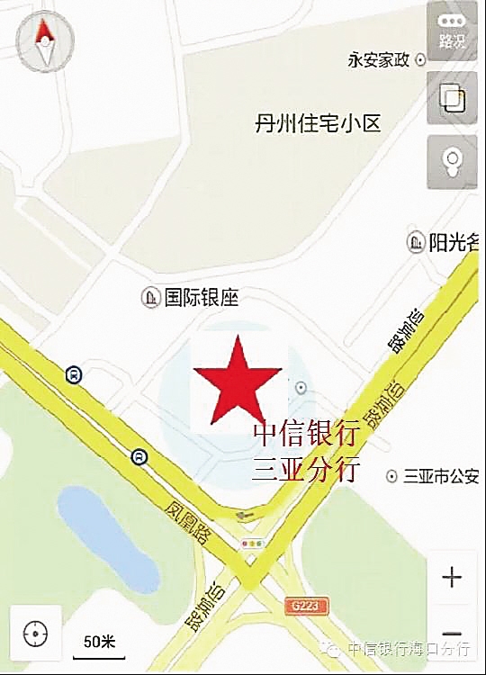 中信银行三亚分行位于海南省三亚市凤凰路聚鑫园G栋1-4层,该地有三大优势。首先,区位优势优越。该地段为三亚黄金地段,位置醒目,迎宾路为南北向的重要标志道路,凤凰路为市内贯通东西的景观大道,与迎宾路交叉口的位置就成为了三亚市的黄金路段。此地段为金融机构聚集地,附近设有工行东方支行、农行迎宾支行、中行迎宾支行、建行迎宾支行、光大银行凤凰路支行、邮储银行丹州小区支行、农业发展银行三亚市分行等众多金融机构网点,具有较大的市场潜力。