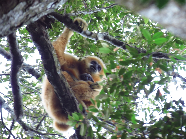 濒临灭绝的海南长臂猿是国家一级野生保护动物,仅生存于霸王岭国家级自然保护区。图为1月22日,监测队员在霸王岭大石头监听点拍摄到的母猿怀抱幼崽照片。