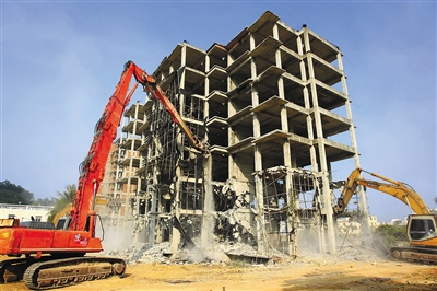 据介绍,违建的两栋大楼均为2009年动工,在2010年城管下达违建通知书时停工。但由于当时周围低矮建筑较多,为避免造成对周边建筑的破坏而推迟至今。据悉,4年间,区城管逐一清理了周围低矮违建。