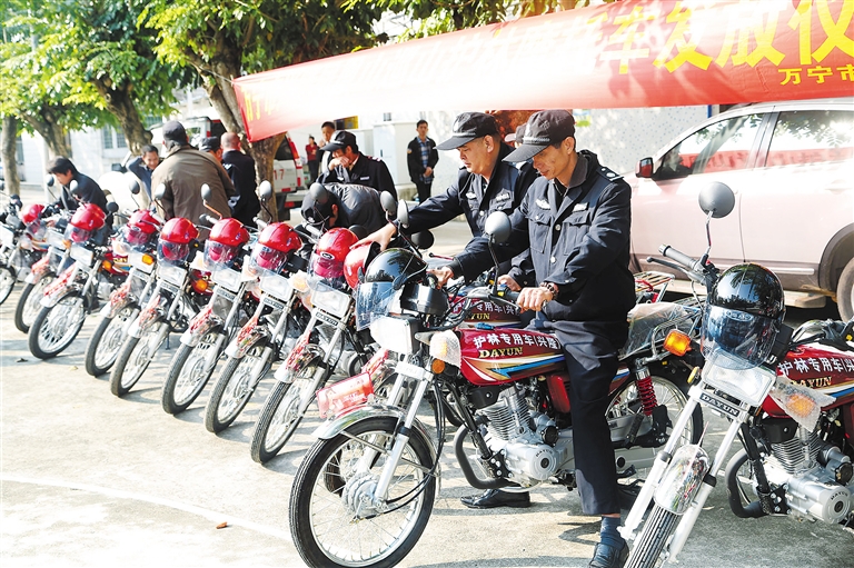 1月22日,万宁凤凰山护林队队员正在试用新摩托车。当天,万宁市林业局给获评2014年度“感动海南十大人物”的万宁凤凰山护林队赠送16辆崭新的摩托车,解决他们巡山护林缺乏交通工具的难题。 据介绍,万宁凤凰山护林队自1992年来,在没有一分钱补贴和没路没电没水的情况下,默默坚守,徒步巡山,为海南保住了3.5万亩低海拔热带雨林。
