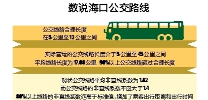 海口市政协主席韩美说,他们多次乘坐公交车深入社区,了解基层老百姓最真实的出行心声。根据调研,海口市在公交线路的设置上非常不合理:公交线路长度介于5公里至45公里之间,平均线路长度为17.08公里,但根据海口市建成区面积、人口和调查所得公交乘客平均出行距离计算,合理的公交线路长度应在5公里至12公里之间。可见,海口90%以上的公交线路长度超过合理长度。