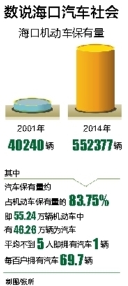 一份来自海口市交警支队的资料显示,从2001年的40240辆到2014年底的552377辆,13年时间,海口机动车保有量增长了13倍。其中,2001年—2011年年均增速22%。