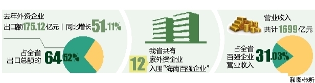 据了解,外资企业在全省经济运行中持续发挥重要作用,对我省出口和工业增加值两方面贡献较大。去年外资企业出口额175.12亿元,同比增长51.11%,占全省出口总额的64.52%。重点外资企业领军我省“百强企业”,去年我省共有12家外资企业入围“海南百强企业”,营业收入共计1699亿元,占全省百强企业营业收入31.03%。其中海航集团和中石化海南炼化分别占据“海南百强企业”第一名和第四名,营业收入分别为1156亿元和329亿元。