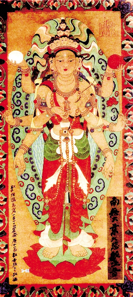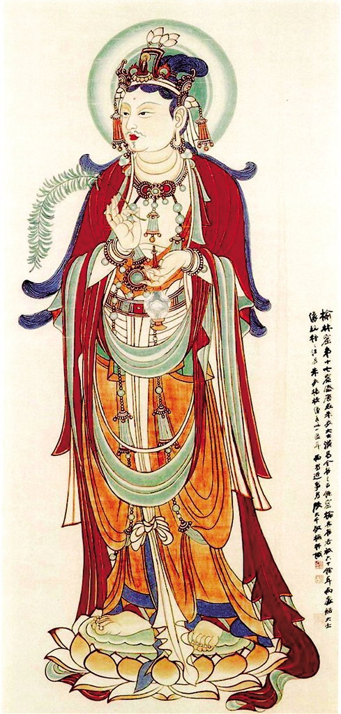 敦煌石窟是中国著名的石窟艺术宝库,敦煌壁画作为民族瑰宝,集东方中古美术之大成,有着极高的艺术价值。上个世纪四十年代,著名画家张大千先生不远千里来到敦煌,面壁三年,进行“临摹传写”、“考订年代”和“探究源流”,并将壁画临摹品展览于世界各地,对宣传敦煌艺术、弘扬民族文化作出了巨大贡献。