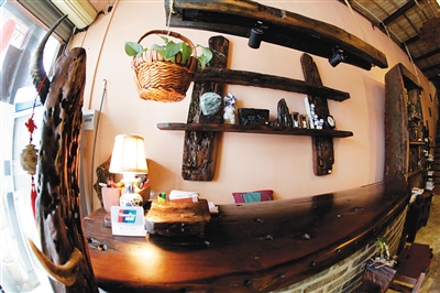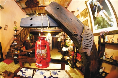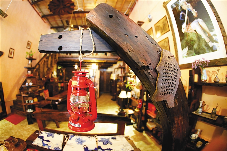 走进位于海口骑楼老街的小店“老船长”,就仿佛置身于一座古老而神秘的船舱。桌椅、画框、台灯乃至楼梯的扶手……目光所及之物,几乎全是由一块块船木精巧打造而成,在昏黄暖人的灯光下,晕散着幽暗迷人的光圈。
