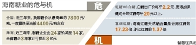 海南省糖业协会理事长王达洲忧心忡忡的表示:“全省制糖企业已由三年前的24家锐减至目前的14家,全省糖企3年累计亏损近8亿元。由于成本售价倒挂,今年榨季,我省多数甘蔗收购款都无法及时支付。”