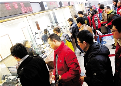 1月25日,一些旅客在铁路上海站办理退票手续。 临近2015年春运,铁路上海站迎来退票高峰,目前上海地区日均退票量达7000张左右,这一数字预计还会增加。据悉,大量退票的产生,与预售期拉长、退票规定改变等因素密切相关。 新华社记者 陈飞 摄