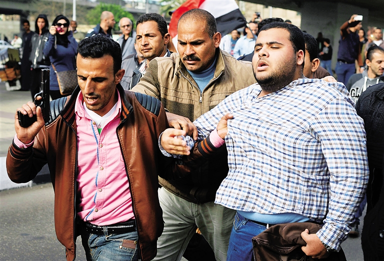 1月25日,在埃及开罗,一名便衣警察(左)逮捕一名反政府示威者。 1月25日是埃及前总统穆巴拉克政权被推翻4周年“纪念日”,埃及多地当天爆发游行示威并引发冲突,造成至少23人死亡、近百人受伤。 新华社/法新