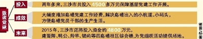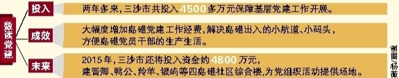 两年多来,三沙市共投入4500多万元保障了基层党建工作的开展;大幅度增加岛礁党建工作经费,提高“两委”干部的补贴报酬;解决了岛礁出入的小航道、小码头,方便岛礁党员干部的生产生活。