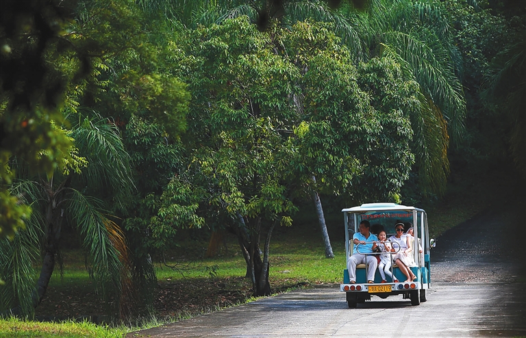 斜着身子探出枝干的大树上,爬满了附生的安培兰、青果榕上吊着一串串圆圆的小青果、低矮处茂密的香叶露兜散发出令人心旷神怡的香气……在万宁热带花园,设计者十分用心地为游客们恢复了热带雨林的风貌,在这里,孩子们能够一探热带雨林的景象。