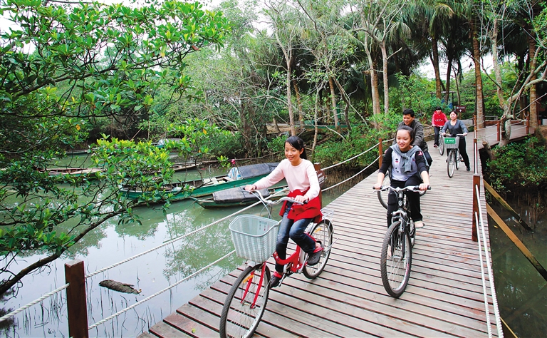 与红树林亲密接触,认识多样生物、在木栈道上骑行,放松身心、在农家乐钓鱼摘菜,体验农家乐趣……在文昌八门湾,家长们能和孩子在这里展开一场别有生趣的红树林之旅。在这里,孩子们不但能够收获自然知识,还能在骑行和劳作中得到锻炼。