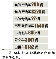 据介绍,今年春运投放的1.5万多辆营运客车中,包括省际班线车266辆,省内班线车3228辆,市际专线车27辆,市县际旅游车1546辆,市内包车805辆,公交车3047辆,出租车6152辆,另储备了240辆旅游车和10辆市县际包车。