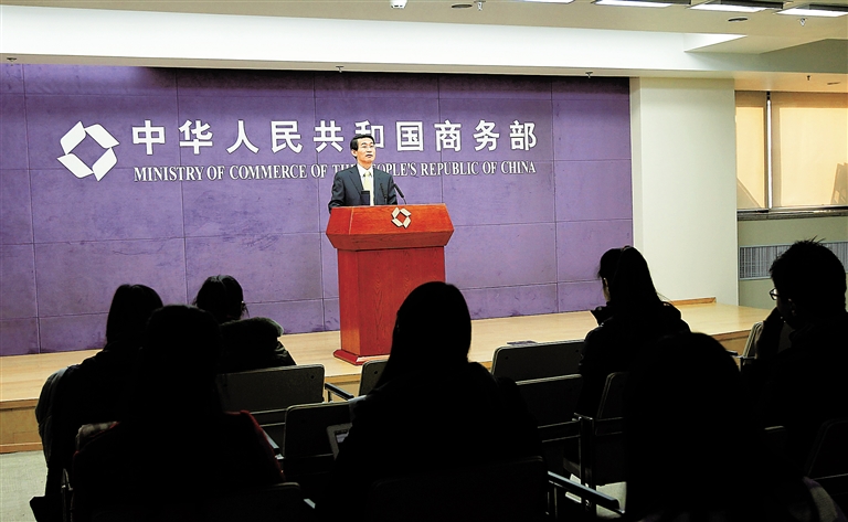 1月29日,商务部新闻发言人沈丹阳在介绍情况。 当日,商务部在北京举行新闻发布会,新闻发言人沈丹阳在发布会上说:政府、企业与消费者应合作打击网络假冒产品,政府应完善相关法律,利用大数据与云计算来根除网上假货。 新华社记者 邢广利 摄