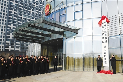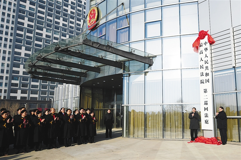 1月31日,最高人民法院院长周强(右二)与辽宁省委书记王珉(右一)为最高人民法院第二巡回法庭揭牌。 当日,最高人民法院第二巡回法庭在辽宁省沈阳市挂牌,巡回区为辽宁、吉林、黑龙江三省。最高法第二巡回法庭庭长为最高人民法院审判委员会副部级专职委员、二级大法官胡云腾,同时配备副庭长两名。巡回法庭由庭长、副庭长、廉政监察员、主审法官、助审员、法官助理、书记员、综合行政人员组成,对人员分类管理,两年一轮换。据了解,巡回法庭2月1日开始受理和审理案件。 新华社记者 潘昱龙 摄