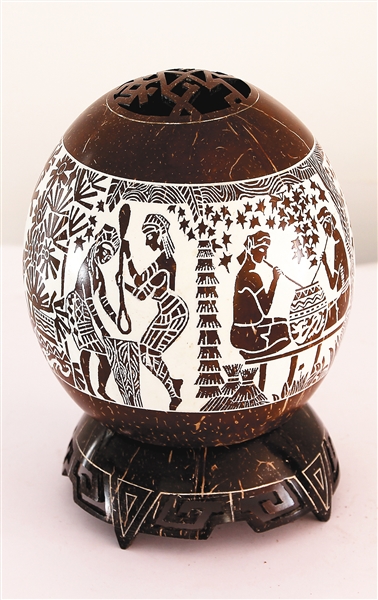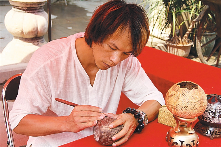 这一年,在省非遗中心陈佩等人的协助努力下,由国家非遗项目海南椰雕传承人吴名驹以“海南椰雕”作为申报项目,成功入选了世界“杰出手工艺品徽章认证”(以下简称“徽章”项目)。这种探索性尝试的成功很快带来了收效,在获得该项目认证后不久于山东举行的第三届中国非物质文化遗产博览会上,吴名驹的“海南椰雕”受到广泛关注,并成为非物质文化遗产项目对接洽谈和交易签约仪式上的“明星”。