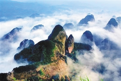 八角寨把广西资源和湖南新宁连在一起,大自然的鬼斧神工就不用再多赘述了,有意思的是大自然造物何等公平,在两省各撒了一半的山群,让他们各自“闹海”和“观天”,不管斗转星移,也不管沧海桑田,这些可爱秀气的小山峰远远近近地在云雾中若隐若现,像一群天真的孩子躺在棉花上,岿然不动地看着世间风云变幻。于是,八角寨上观景台上不仅可以一脚踏两省,还可以一览广西境内的“群螺观天”和湖南境内的“群鲸闹海”,别有一番风情。在八角寨上看群峰随着云雾散去,迎来阳光的心情无异于期待一次花开。丹霞地貌的山群在阳光下一点点露出,青山红崖的相互映衬,着实让人们惊艳了一把,似乎这一秒和下一秒的景色都有很大差别,体验这样现实版的梦幻效果除了让人心悸,还有一种莫名的感动。感谢大自然对这片土地的偏爱,把这些美景瞬间绽放,让身处自然美景中的人们定格在了想象世界中的永恒。