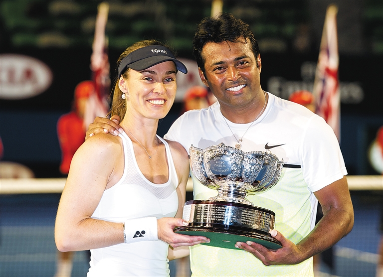 北京时间2月1日,在澳网混合双打决赛中,七号种子辛吉斯/佩斯以6:4/6:3完胜卫冕冠军梅拉德诺维奇/内斯特,夺得冠军。这是“瑞士公主”辛吉斯时隔九年后再度捧起澳网混双奖杯。图为辛吉斯(左)和佩斯在颁奖仪式上。新华社发