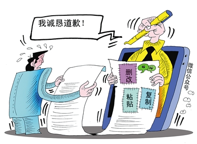 微信公众号每天传播着大量信息,在方便手机一族的同时,也产生了造谣传谣、侵犯版权等问题。一些公众号一边大肆抄袭、篡改他人稿件,一边利用别人的文章吸引关注,赚取广告费用。这样的行为,不仅涉嫌侵权,也吸吮着原创者的血汗,破坏着新媒体行业的舆论生态。这正是: