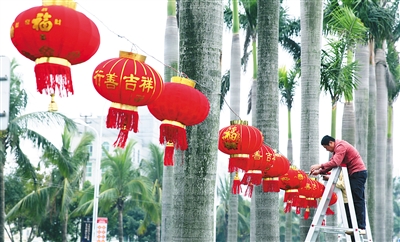 春节临近,海口建国路、红城湖路、朱云路等路段陆续挂起红灯笼,以营造喜庆祥和的节日气氛。