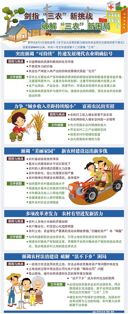 今天,在中国经济发展步入新常态的背景下,2015年中央一号文件继续锁定“三农”,表明“三农”问题在中国“重中之重”的地位非但没有弱化,反而更为加强。当前,中国正处在四化建设和全面实现小康社会的关键时期、冲刺阶段。全面建成小康社会,不能缺了农村这一头。四化建设,必须补齐农业这一短板。在国家各项工作中,“三农”的重要属性仍十分明显。这些因素决定“三农”仍是中央亟须和重点部署的工作,也正是缘于此,今年的中央一号文件第12次将靶心锁定“三农”。(新华社北京2月1日电)