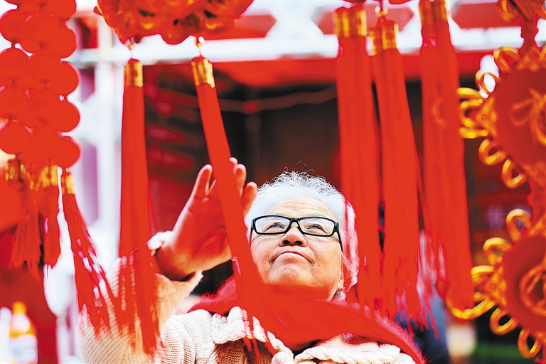 2月1日,在山西运城南风广场,顾客在挑选挂饰。 春节临近,各地年货市场红火,节日的喜庆气氛日渐浓厚。 新华社发(鲍东升 摄)