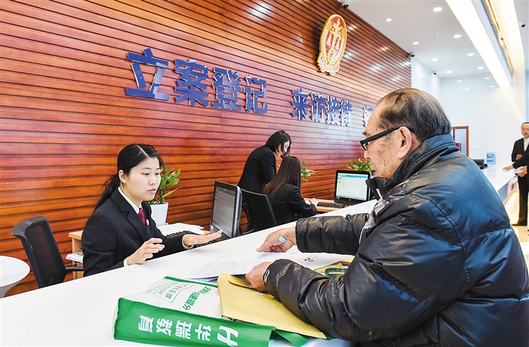 2月2日,书记员(左)在位于深圳的最高法第一巡回法庭进行诉讼登记。 当日,最高人民法院第一巡回法庭开始正式受理案件。最高法第一巡回法庭1月28日在深圳挂牌,巡回区为广东、广西、海南三省区。新华社发