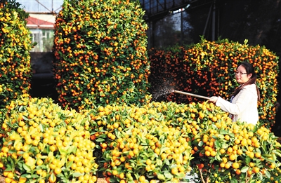 1月28日,随着春节临近,年桔陆续上市。在海口花卉大世界,商家在养护刚上市的年桔。据了解,年桔又称“金桔”,属观赏类植物,海南人素有过年在家中摆年桔的习俗,以此象征大吉大利、富裕和幸福。本报记者 张茂 摄
