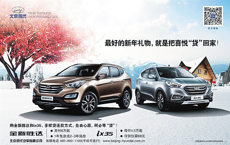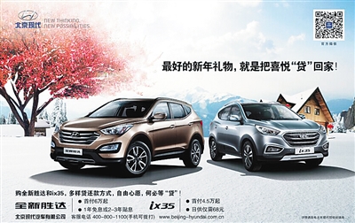 另外,北京现代推出SUV狠“贷”劲活动,凡购买北京现代全新胜达、ix35车型即可享一年免息,更可畅享“5050计划”——首付50%,一年后付50%尾款,一年免月供。ix25首付24000元起日供68元轻松贷回家。