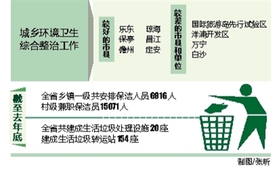 同时,我省农村垃圾清扫保洁工作逐步纳入公共财政保障范围。截至去年底,全省乡镇一级共安排保洁人员6916人,村级兼职保洁员15071人。全省自然村19556个,已安排生活垃圾清扫保洁的自然村17782个,覆盖率达90.9%。其中保亭、乐东、昌江、五指山、琼中、澄迈、东方、定安、白沙等9个市县做到了全覆盖,儋州、琼海、临高等市县覆盖率达95%以上。