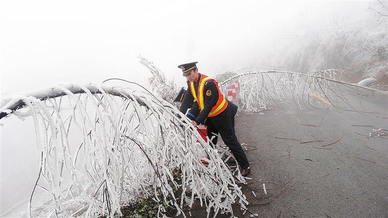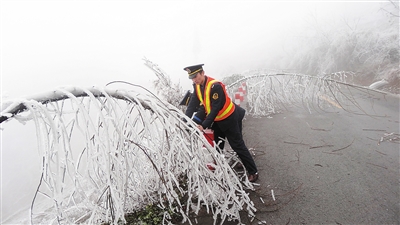 2月3日,贵州遵义正安公路管理段路政人员在303省道清理被压弯的行道树。 由于雨雪冰冻天气,贵州遵义正安县境内303省道K311至K340路段沿线的行道树被冻弯压倒,正安公路管理段路政人员及时进行清理,保障交通安全。 新华社发