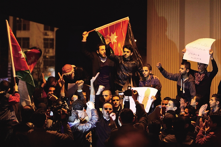 ①2月3日,约旦人在首都安曼抗议极端组织杀害劫持的约旦飞行员。
