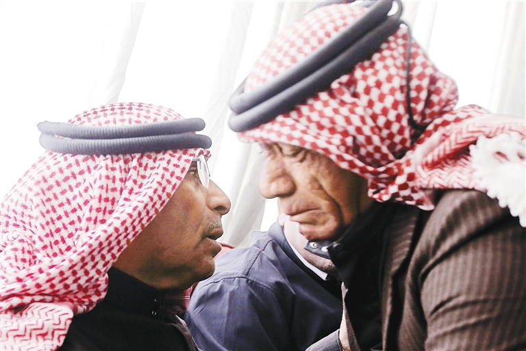 ②2月4日,在约旦城市卡拉克,一名男子在悼念仪式上安抚约旦遇害飞行员卡萨斯贝的父亲萨菲(左)。