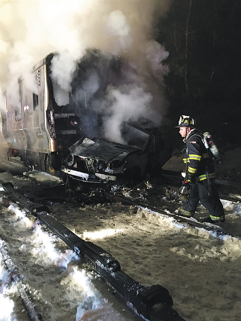 2月3日,在美国纽约州的瓦尔哈拉,发生撞车事故的火车冒出浓烟。
