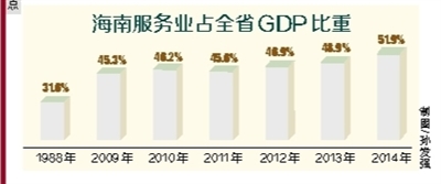 从占比上看,近年来海南服务业占比出现了明显增长。数据显示,海南服务业占全省GDP的比重,1988年为31.6%,上世纪90年代初期达到40%以上,2009年为45.3%,2010年至2014年依次为46.2%、45.6%、46.9%、48.9%、51.9%。