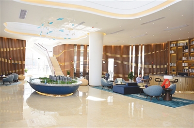 广物·滨海国际全新海景营销中心从外观至内里,从地面到天花板,无一不呈现着海洋元素巨大的生命张力。鱼形态的灯饰、海浪形状的形态构筑、各类富有情趣的艺术装置,将现代建筑精粹与海洋艺术手法巧妙结合。