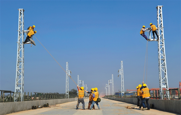2月4日下午,中铁电气化集团海南项目部施工人员正在新建海南西环铁路3标白马井段安装接触网立杆。据了解,目前新建海南西环铁路电气化设备安装全面铺开,截至5日下午6时已竖立接触网电杆1万余根,完成全线接触网电杆量的63%。预计6月中旬将完成全线的电气化设备的安装,9月首列调试动车将上线调试运行。