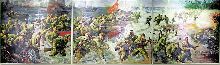 他告诉记者,创作此类题材作品,必须对表现的历史人物、事件有充分认知。他举例,在创作《解放海南岛》时,他就耗费数月查阅相关书籍,实地调研观摩。这一点我们从画中惟妙惟肖的“英雄船”、老炮台等精妙细节可窥一斑。
