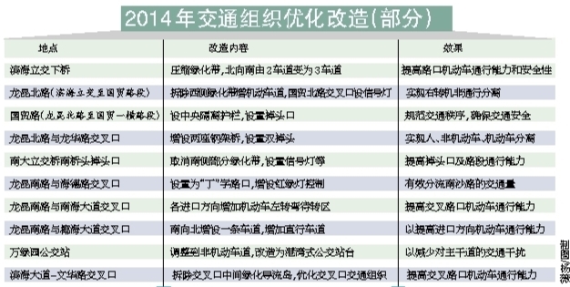 细心的市民近年来都会注意到海口道路上的一些小变化:滨海大道东段的中央绿化带小了,多出了一个车道,路口通行能力增加了;玉兰路、丽晶路等交叉路口拆除了绿化导流岛,交叉路口拓宽了,过街更方便了;南大立交桥南桥头调头口车道增加了,排队时间短了;龙昆沟架起了钢结构便桥,车辆调头与行人过街两不误……