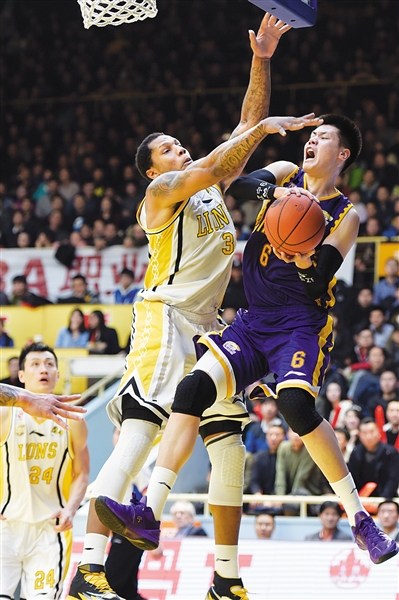 2月7日,在中国男子篮球职业联赛(CBA)季后赛四分之一决赛第一场比赛中,浙江广厦队主场92:100负于辽宁队。图为辽宁队贺天举(右)在比赛中进攻。 新华社发